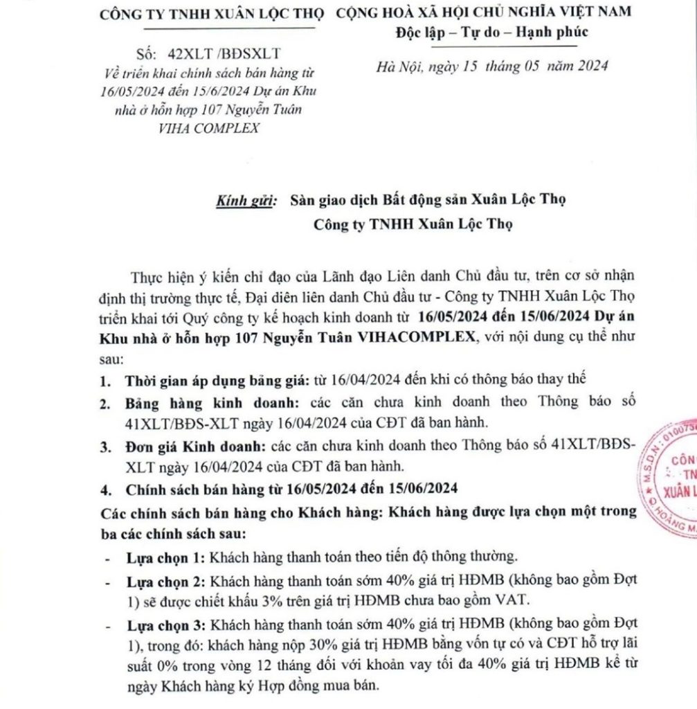 CHÍNH SÁCH BÁN HÀNG CHUNG CƯ VIHACOMPLEX - VIHA LECIVA 107 NGUYỄN TUÂN